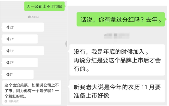 经理却表示,上不了市也没关系,因为还可以分红。然而当记者询问其他合伙人是否有得到过分红时,该合伙人说:“分红要品牌上市后才有。”