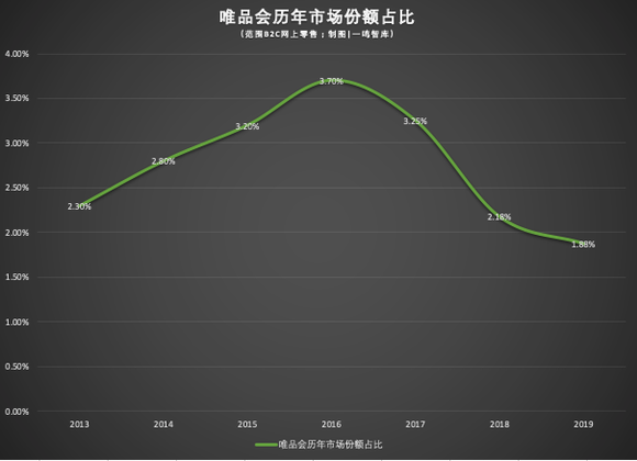 数据显示,2016年以来,唯品会市场份额连续下滑,从2016年3.7%的高点下滑至2019年的1.88%。