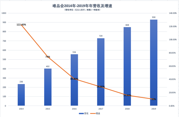 但快速的扩张带来的灾难也在酝酿。从2015年开始,唯品会营收增速开始下滑。根据其财务数据,2015年,唯品会实现全年总净营收402亿元人民币,运营利润20.7亿元人民币,年活跃总用户数达3660万,营收增速下滑至74%,并一路走低,到2019年仅为10%,这远低于2019年中国电商销售增速高达35.2%的增速。