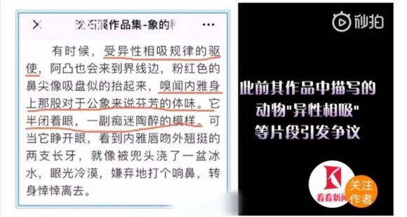 前不久,儿童文学作家沈石溪的作品因描写“动物异性相吸”引发争议。一些家长认为,过早接触情欲、暴力等“禁忌”话题不利于儿童的身心健康。上海书展期间,沈石溪在进行新书宣传时对此做出了回应。他认为,这样的描写无伤大雅,但如果有老师家长觉得不适于“年龄太小的”孩子阅读,自己和出版方也会做一些“更正”,比如模糊处理,或者“把敏感的句子去掉”。