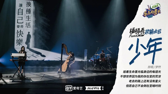 不得不说,福禄寿对于《少年》的改编非常用心,且使用了相当多的音乐元素,尤其在歌曲的中间部分所加入的电子乐元素,譬如“警报声”,以及通过击打竖琴而模仿底鼓的做法,颇有“号角”和“战鼓”之意。而“宣战”结束 ,“战斗”便开始,直到所有的迂回、抗争、占领,全都汇聚在她们自己新加的歌词上:“ 我不想愧对那晚星光,即使天从未亮。即使头顶高墙,再看看,看我温柔故乡,看我的信仰,变成了这般模样”。如同她们自己所说,这个“少年”,才是自己。