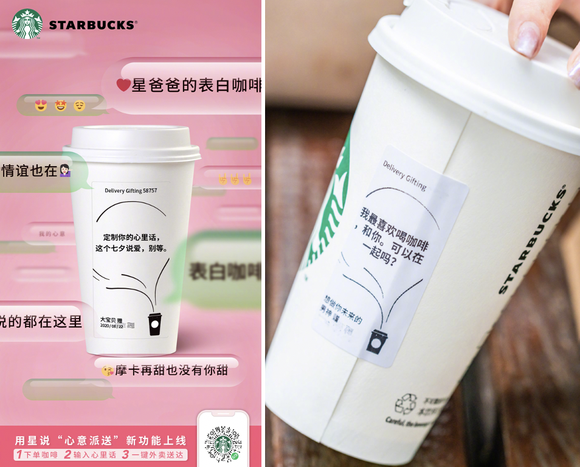 今年七夕,星巴克用星说上线“心意派送”功能。通过此功能,用户为心动之人点上一杯咖啡,就可以在咖啡上编辑祝福,祝福会印在杯子上和饮品一同送到TA的手边。