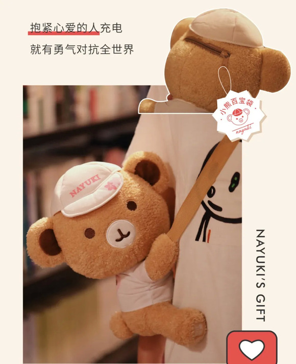 其中最有意思的是粉粉熊斜挎包,将熊设计成抱抱的姿势,背在身上就像被拥抱,并附有“抱紧爱人充电”的slogan,足够低调含蓄。
