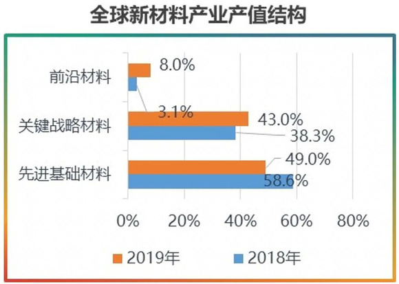 全球新材料产业由2016年2.09万亿美元增长至2019年2.82万亿美元,年均复合增长达7.7%,其中2019年同比增长超过10%。从2019年新材料产业构成看,先进基础材料产值比重占49%,关键战略材料产值比重占43%,受3D打印材料、石墨烯、超导等新兴产业技术不断突破,前沿新材料比重由2018年的3.1%,上升到8%。