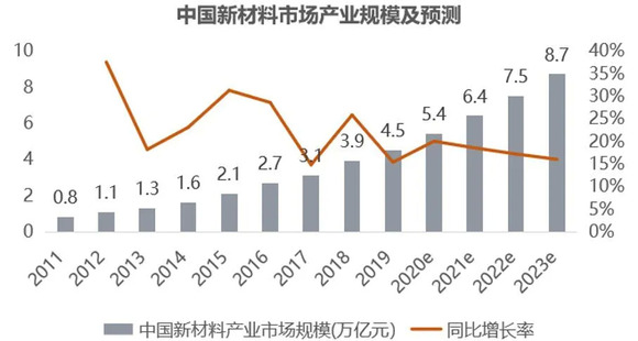 中国自“九五”开始就将新材料作为发展重点,自从“十二五”以来,国内的新材料技术发展取得了很大的进步。我国新材料产业产值从2011年0.8万亿增长至2019年4.5万亿,年均复合增速达到21.2%,增速十分显著,占全球新材料产值比重从2016年20%左右提升至2019年23%左右。