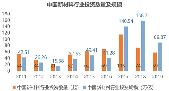 由于新材料的战略地位以及对其他新兴产业的支持、推动作用,新材料产业发展一直以来得到国家的大力支持,民间资本看好新材料的发展前景也大量涌入。2019年我国新材料行业投资数量为59起,单笔投资规模相比2011年增加近一倍,投资规模达到89.87亿元。