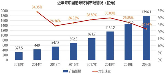 受益于纳米技术的不断革新、新应用领域不断开拓的影响,全球纳米材料市场快速增长,全球市场规模超过1000亿美元。中国2018年纳米材料行业市场规模达到1150亿元,以年均20%的增长速度快速爆发。