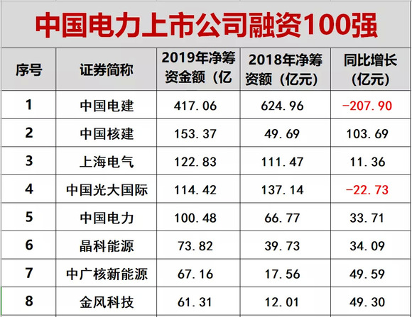 “中国电力上市公司融资100强”企业2019年净融资规模合计为2011.47亿元,较2018年增长了496.89亿元。