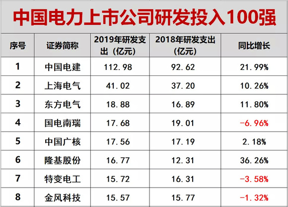 据黑鹰光伏统计,“中国电力上市公司研发投入100强”企业在2019年研发投入合计为578.24亿元,较2018年增加了97.49亿元,增幅为20.28%。
