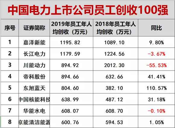 据黑鹰光伏统计,中国电力上市公司员工效率100强榜入榜门槛为员工年均创收为234.58万元,前三名为嘉泽新能(1195.82万元)、长江电力(1179.59万元)和川能动力(894.92万元)。