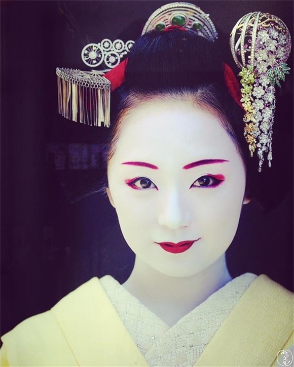 艺妓化妆也十分讲究,浓妆的施用有特殊的程序,用料也以传统原料为主。最醒目的是,艺妓会用一种液状的白色颜料均匀涂满脸部、颈项,因此看起来犹如雕饰华美的人偶一般。