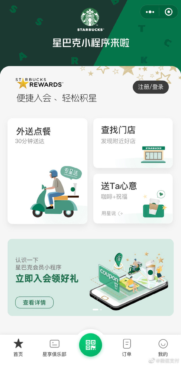 随着星巴克小程序在微信上线,全国各地用户均可通过扫小程序码或微信搜一搜“星巴克”进入小程序,一键调用手机号码进行注册,即可注册成为星享俱乐部成员,并获得三重入会礼包。