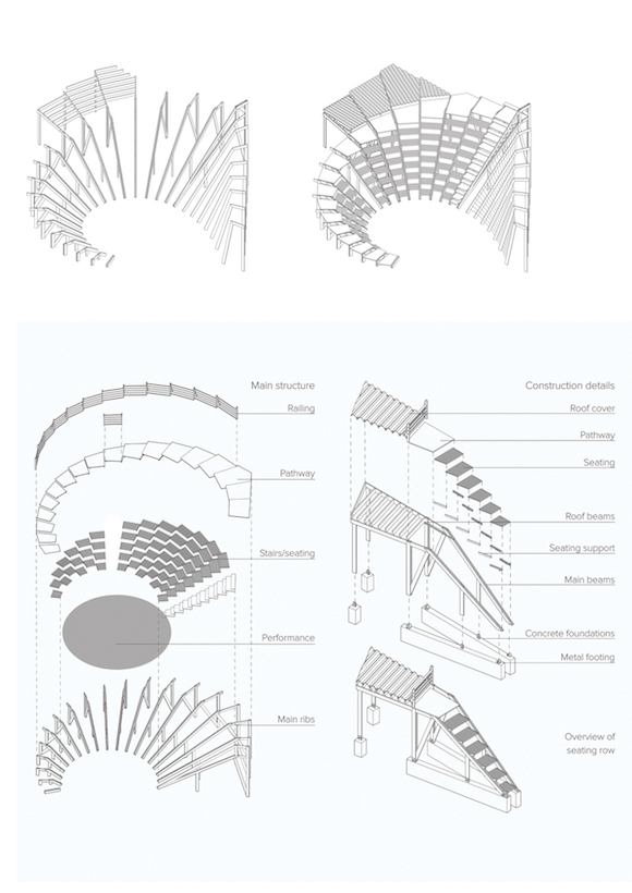 为了把垃圾场改造为剧场,Sitio Eriazo 先花了大力气,把成堆的垃圾进行了清理,随后还将规划区域进行了“封场”,以避免周边的居民仍然会往“垃圾场”丢垃圾。一切就绪后,The Scarcity and Creativity 进行了实地勘探。考虑到新建的小剧场该与周边环境匹配,他们决定采用木材,搭建一个类似 “斗兽场” 形状的建筑结构。同时,这样的结构也能控制整个建筑的占地面积,并保证足够的灵活性。