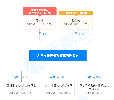 目前,该公司第一大股东为范冰冰,持股74.5%,第二大股东为范冰冰母亲张传美,持股比例25.5%,张传美同时也是公司最终受益人。