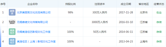 据天眼查显示,无锡爱美神影视文化有限公司成立于2015年7月,注册资本1500万人民币,经营范围包括广播电视节目的制作;电影的制作、发行与放映;组织文化艺术交流活动,演出代理,演出营销;设计、制作、代理和发布国内广告业务等。旗下拥有无锡唐德文化传媒有限公司、北京二十画文化传媒有限公司以及霍尔果斯爱美神影视文化有限公司三家控股子公司。