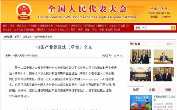 2015年10月十二届全国人大常委会第十七次会议首次审议《电影产业促进法(草案)》。不出意外《草案》若能经全国人大常委会二次审议通过,《电影产业促进法》便能在2016年颁布实施。