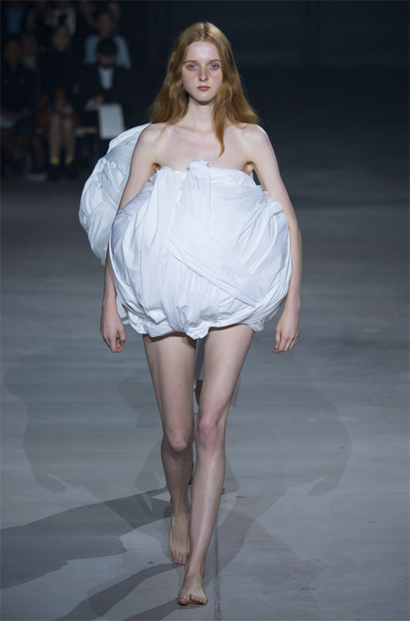 在秀场和成衣设计上,那些天马行空的不对称裁剪、超大尺寸的廓形、半脸妆容以及赤脚袒胸的模特,更是让品牌 Jacquemus 被时尚评论家 Susanna Lau 认为是“夹在巴黎时装的排期中,像一股涌动的新鲜空气。”