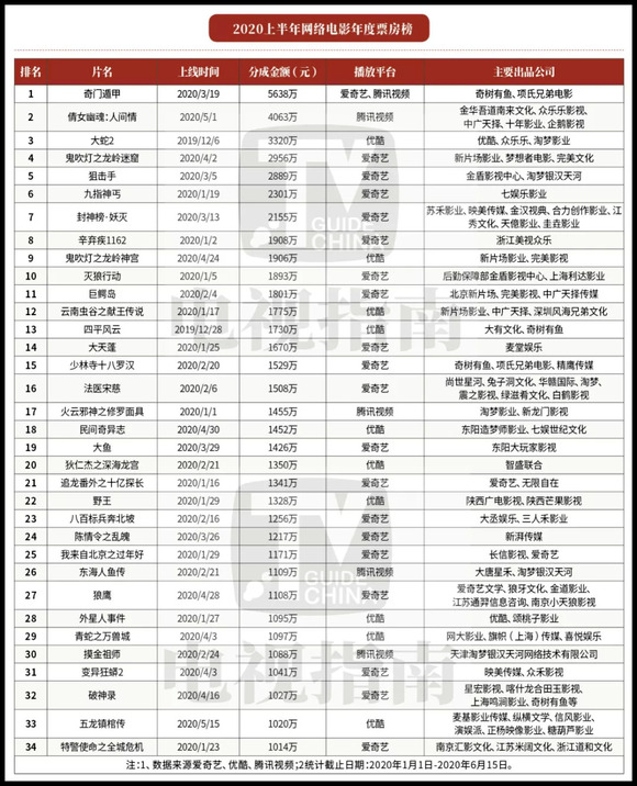 据灯塔电影《2020上半年网络电影市场报告》显示,今年上半年共上线网络电影391部,其中38部分账票房超过千万。优酷、爱奇艺两家平台共34部电影分账票房破千万,是去年同期的2倍多。