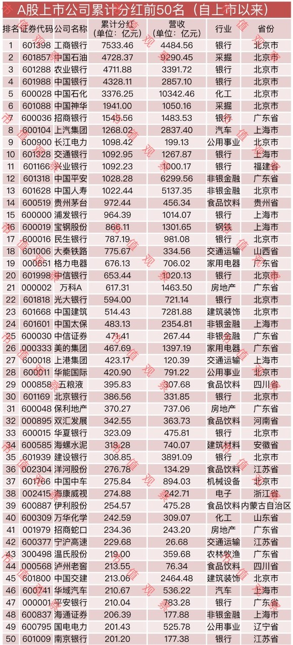 自上市以来累计分红前50家公司,这50家公司已经累计合计分红达到5.04万亿。