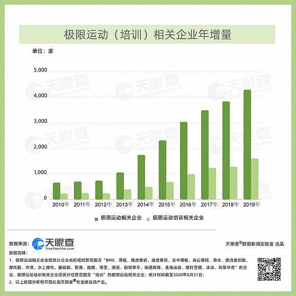 2010-2019这十年期间,天眼查专业版数据显示,我国极限运动相关企业(全部企业状态)注册总量由原来的8,000家增长至近3万家。其中,2016年相关企业注册增速最快,高达20.47%,2019年相关企业注册总量最多,达到4,200家。 但时有发生的伤亡事故,让这类危险系数颇高的极限运动充满争议。新华社每日电讯报道指出,专业人士认为,近年来户外极限运动之所以事故频发,是由于越来越多不具备相关技能的人参与其中。记者采访发现,在户外极限运动培训逐渐市场化后,出现了培训机构盲目开办“速成班”等乱象,威胁该类运动的健康发展。