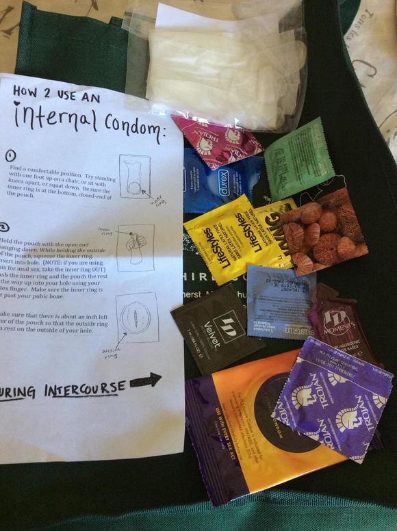 当九月份Hampshire College的学生们第一次走进这个新英格兰地区风景如画的校园的时候,他们像世界各地的大学生一样收到了装有各种贴心物品的welcome bag。翻开包,里边有短期用的洗漱用品、洗衣粉、急救包、文具、零食、饮料。但是,等等,一个透明袋子里装的东西却格外显眼,许多学生拿出来的时候都吃了一惊,不可思议地说着“What?!"