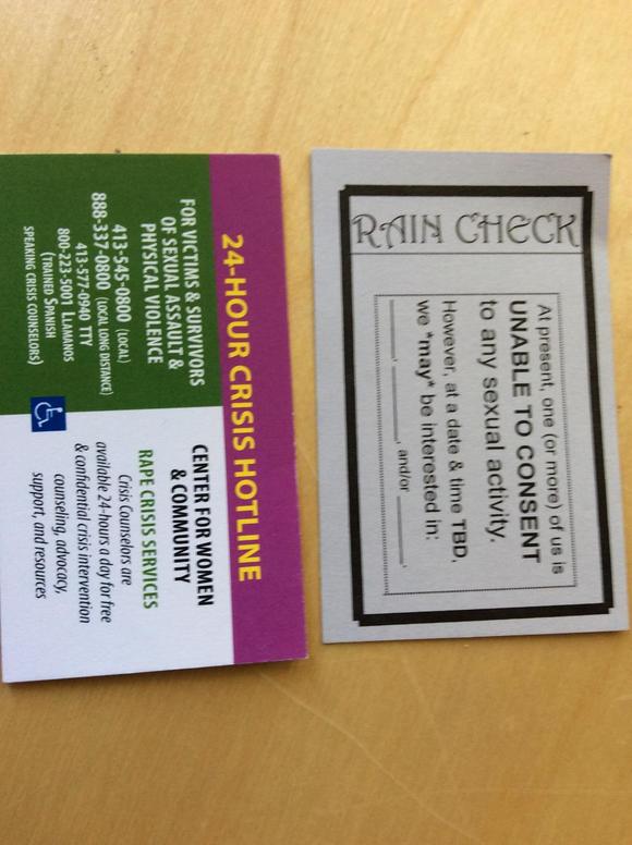 这两张卡片,其中一张写有学校对于性侵行为的紧急电话和保密咨询的联系方式,另一张卡片则是用在对方还未做好准备同意进行性行为但今后有可能的时候留下自己的联系方式。这当中所涉及到的consent culture十分重要,在中国却还未被认知,小编接下来会详细解释。