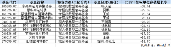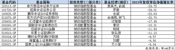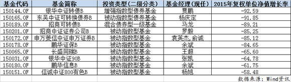 不过,仍有一部分基金2015年里亏损严重,重灾区为分级基金B份额以及相应的指数基金,亏损最多的为银华基金经理贾鹏管理的银华中证转债B(150144),年度回报为-92.59%。下表为全基金市场中亏损最多的前十基金名单: