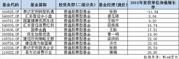 虽然年度前十基金全部被混基包揽,但从后十名看,主动股票型基金的成绩要比混基强一些,只有一只基金—泰达宏利转型机遇(000828)收益为负数(-11.84%),其他均为正收益。