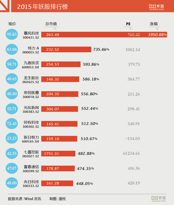 界面新闻根据Wind资讯(复权后)整理发现,2015年度十大妖股,主要集中在新股、重组并购、热点概念、壳资源等相关概念板块。其中,2015年3月份登陆A股的暴风科技(300431.SZ)以全年1950.88%的涨幅夺得2015年度冠军;具备地方国资改革热门概念的老股特力A(000025.SZ)也以年内735.46%的涨幅当仁不让跻身于前十。