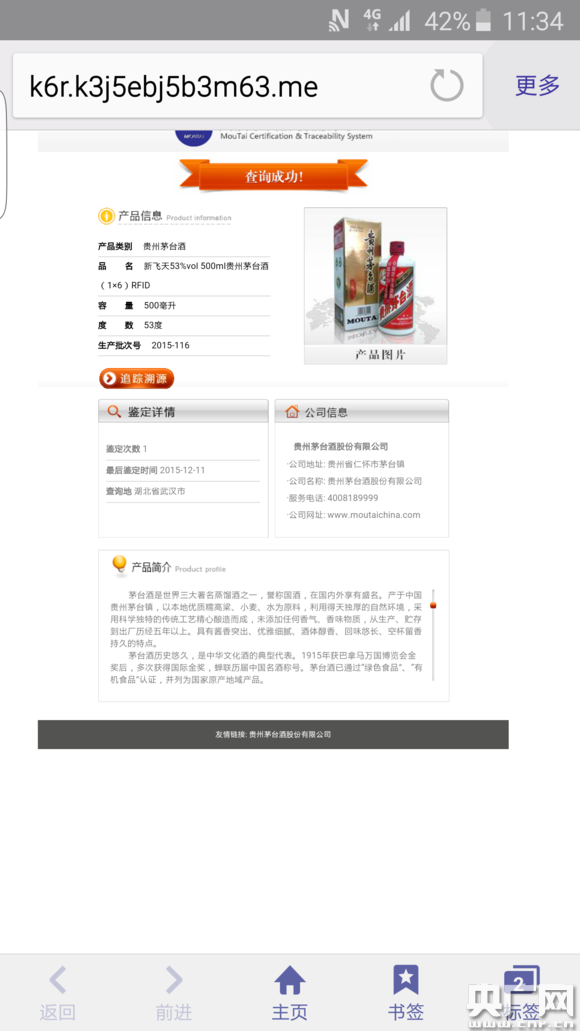 据茅台内部消费人员介绍,用户使用手机下载茅台官方软件,通过手机NFC感应酒瓶上的装置,可以显示出生产时间、批次等信息,消费者发现,从唯品会购买到的茅台也有NFC认证,但打开的网址却是假的。在受骗的消费者中有人想通过茅台NFC认证,却发现NFC认证是一个钓鱼网站。不仔细看很容易上当,在钓鱼网站上,认证成功。