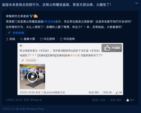 在此之前,《寻龙诀》的官微转发了网友的微博,表示“老板你们这样做,生意是好了,但是是不是太过分了?下载盗版不说,还公然传播?”,并且@了苏宁。对此,苏宁方面暂未做出反应。