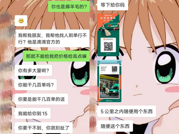 作为一名常年薅羊毛的人员,刘元称自己有几万个手机号,目前已经在滴滴货运平台完成了好几百单,如果和司机合作,司机每天有钱赚,自己至少可以拿到800元。