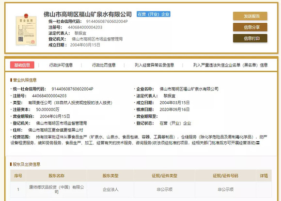 在农夫山泉、怡宝及景田等品牌“激烈厮杀”的华南饮用水市场,曾经一度登顶中国瓶装水行业的康师傅悄然拿下了一家矿泉水公司。今日,小食代从工商信息获悉,康师傅饮品投资(中国)有限公司下新增了一家全资子公司:佛山市高明区福山矿泉水有限公司(下称“福山”),福山的法定代表人也已变更为黎振宜。资料显示,黎振宜现为多家康师傅饮品的全资子公司的法定代表人。