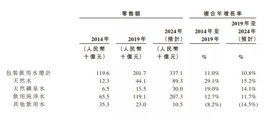 弗若斯特沙利文还预计,天然矿泉水的零售额到2024年将增长至300亿元,2019年~2024年间的复合年增长率为14.1%。
