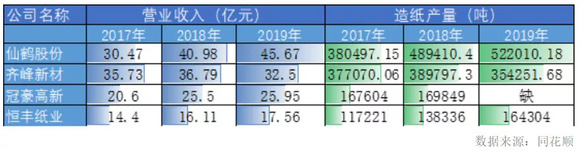 仙鹤股份在招股书中提及的主要竞争对手齐峰新材、冠豪高新、恒丰纸业其2017-2019年营业收入分别如上图所示。营收上,除齐峰新材在2017年领先外,其余仙鹤股份均保持对绝对优势;而在造纸产量上,仙鹤股份始终保持领先。
