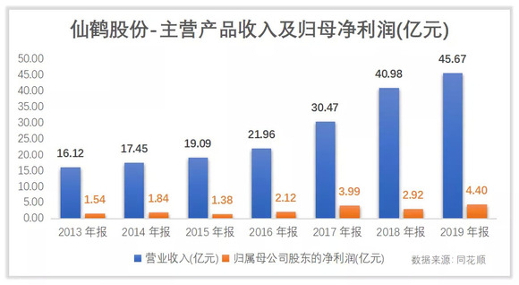 自2013年起,仙鹤股份的主营业务收入始终保持上涨趋势,市场消费强劲,2019销量达到510649.88吨,但由于原料价格波动,造成利润呈现波动上升的趋势。即使是受疫情影响,在2020年上半年,仙鹤股份仍旧交出了不错的成绩单。