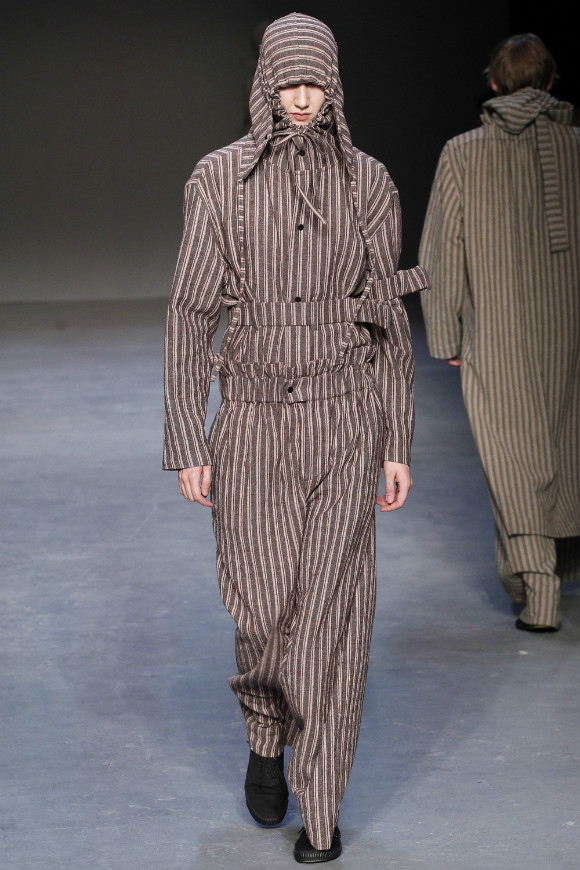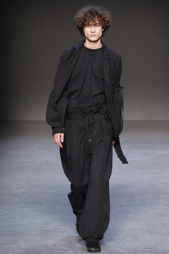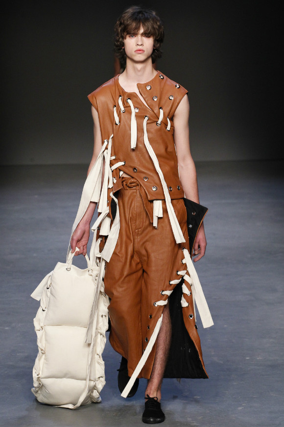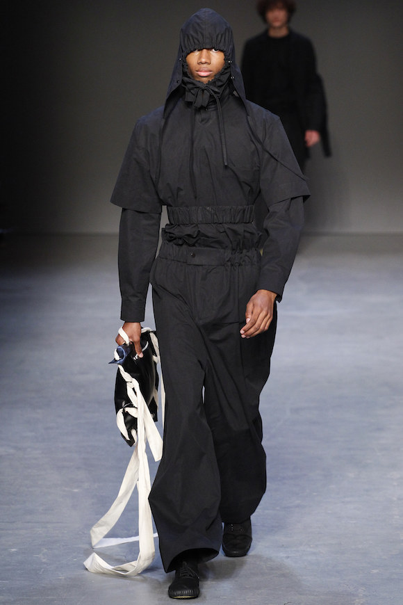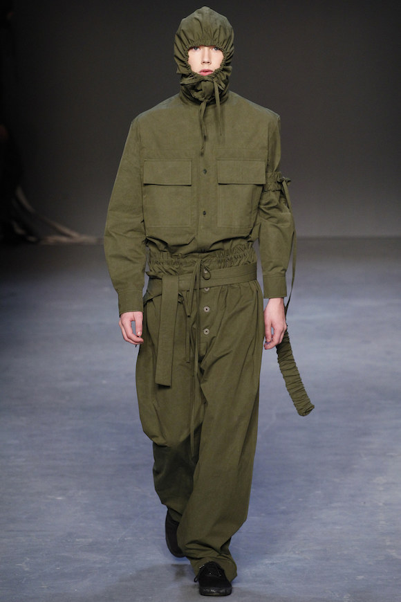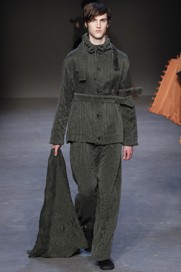 这种风格在 Craig Green 的2016年春夏系列里发挥到了极致,他用大胆的颜色配上飘带,加上富有想象力地对布料进行拼接缝合和挖空,从而把东方韵味做出了层次感。而在这次的秋冬系列里,Craig Green 把飘带和他最擅长的夹克结合在了一起,凭借他对面料的娴熟应用,把丝质做出了轮廓,又使皮革变得飘逸。而相对于春夏系列来说,本季的颜色的饱和度更低,色调也大体偏冷。为了迎接雨季,防水也是该系列的主要特点。