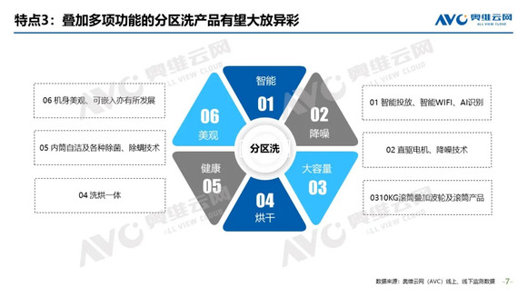 而在分区洗产品的功能表现上,分区洗高昂的价格以及随着市场教育程度的加深,分区洗在功能卖点上也被给予了厚望,叠加智能、降噪、大容量、烘干、健康、美观等功能于一身的分区洗产品更能够获得消费者的青睐。