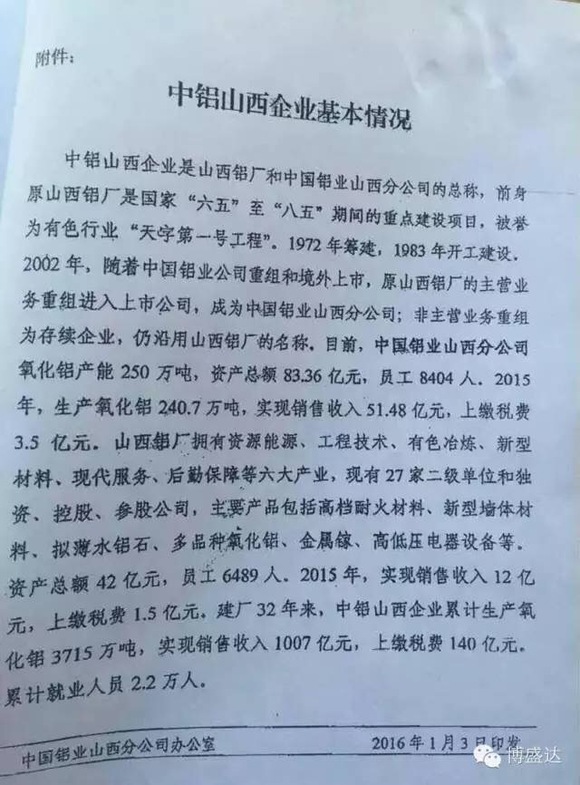 1月9日,微信公号“博盛达”发出一份盖有中铝山西分公司印章的文件。该文件称,中铝山西分公司计划在一季度内实行减产甚至全面停产,届时,将有约1.3万名员工面临下岗失业。