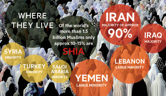 在全世界超过15亿的穆斯林中,10%至15%属于什叶派——尽管没有完全可靠的数据。伊朗是世界最大的什叶派国家:约90%的伊朗人是什叶派。什叶派在伊拉克、巴林以及阿塞拜疆占人口多数。在黎巴嫩,什叶派虽占少数,但他们人数不少,且拥有强大的政治影响力,形成该国最大的单一宗教群体。在科威特、沙特阿拉伯、土耳其和叙利亚,什叶派都占少数,但统治叙利亚的阿萨德(Assad)家族所属的阿拉维教派(Alawi)是什叶派的分支。在也门,什叶派派系栽德派(Zaydi)占该国人口的45%。沙特当下领导的军事行动的目标——也门胡塞叛军——就属于栽德派。印度尼西亚是世界最大的逊尼派国家。在亚洲其他地区,如巴基斯坦、印度、阿富汗、斯里兰卡和缅甸,都有占少数的什叶派。