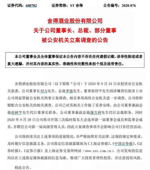 9月24日深夜,ST舍得(600702.SH)发布公告称,公司董事长刘力、总裁李强先、董事张绍平因涉嫌背信损害上市公司利益罪被公安机关刑事立案调查,相关事项尚待公安机关进一步调查。
