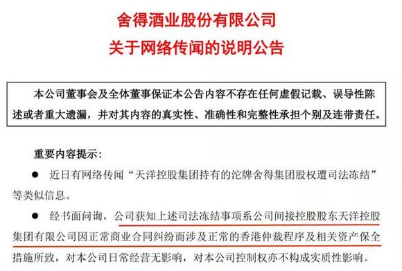 也就是说,天洋控股通过借款拿下了舍得酒业的控制权,一旦天洋控股出现现金流问题,其所持股权就可能被司法处置。所以沱牌集团股权被冻结时,市场一度传言,舍得酒业可能面临实控人易主。