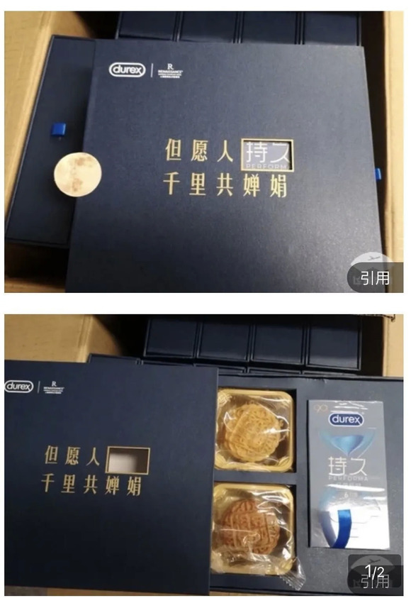 这可能就给老对手杜蕾斯的文案优化提升创造了更大空间,加上杜蕾斯营销团队一贯有出彩的作品拿出。因此,当见到杰士邦的礼盒文案,就很自然地想到杜蕾斯在中秋的文案会是什么样的。今天,终于见到了,只有一张由两个图片拼成的文案图。礼盒包装也只有短短十个字,用的是苏东坡所作词中一句脍炙人口的千古名句的改动。这个改动,又充分结合了产品的功能特点。