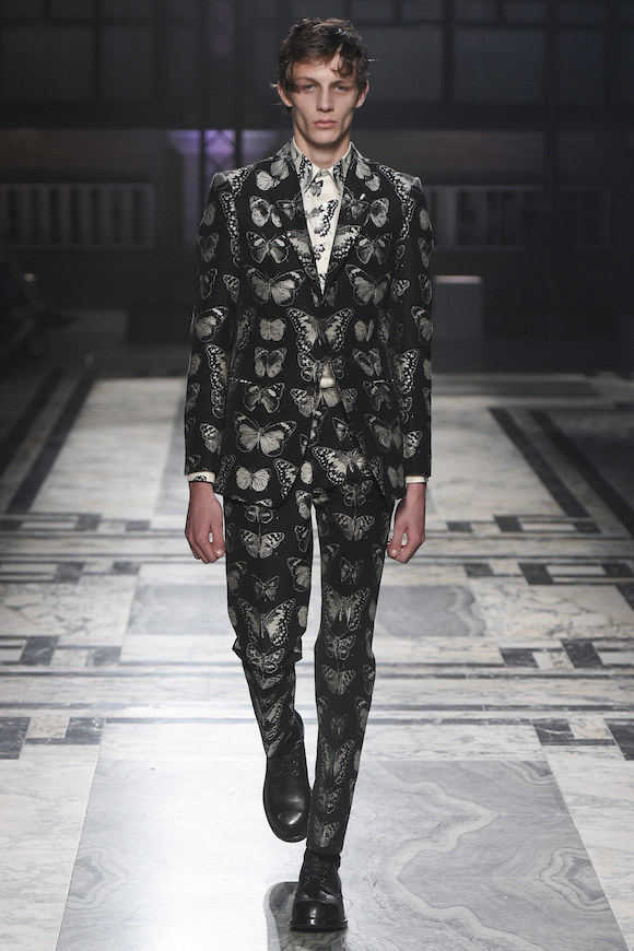 虽然根据之前的报道,麦昆品牌方面并不明说是要致敬创始人。但如今看来,种种细节再明确不过了,麦昆喜爱的蝴蝶出现在品牌的邀请函和新系列的各种品类上,秀场播放的音乐像是丛林密语。婉转的钢琴曲之下,丝绒西服上用银线刺绣的蝴蝶熠熠生辉,黑色、白色、红色是主旋律,仿佛是要暗示某种爱憎分明的情绪。