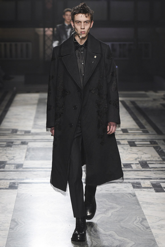 在心理学上,蝴蝶象征着死亡。不得不说,这场秀的气氛令人绝望,模特脸上穿过皮肤的巨大别针令人心寒。它渲染了一种忧郁的情绪,让人忽略了设计本身已经太难突破的事实。