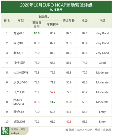 10月1日,Euro NCAP公布了十款车的辅助驾驶评级。车聚君根据官网信息,做了如下整理: