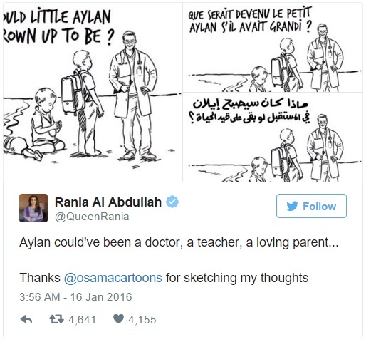 拉尼娅在Twitter中回答道,如果Aylan还活着,他长大后会是一名医生、一名教师,一位慈爱的父亲。这个作品在当天就被Twitter网友分别转发和点赞接近5000次。