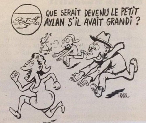 法国《查理周刊》近日因在漫画(下图)中暗示溺亡的叙利亚3岁小难民Aylan Kurdi长大后会成为性侵犯者而饱受抨击。作为回应,45岁的约旦王后拉尼娅(Rania)16日在Twitter和Facebook这两个社交网站的个人页面上发表了由漫画家Osama Hajjaj帮助完成的漫画。