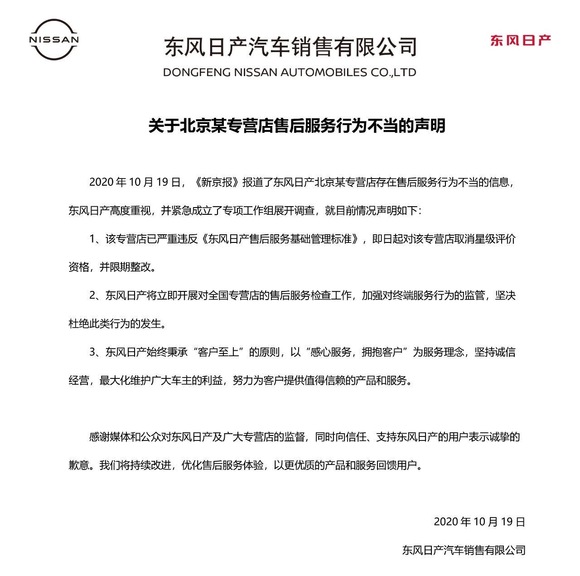 10月19日,针对《新京报》记者在暗访中曝光的北京东风日产晟通专营店售后服务行为不当一事,东风日产发布声明表示:高度重视,即日起对该店取消了星级评价资格,并限期整改。