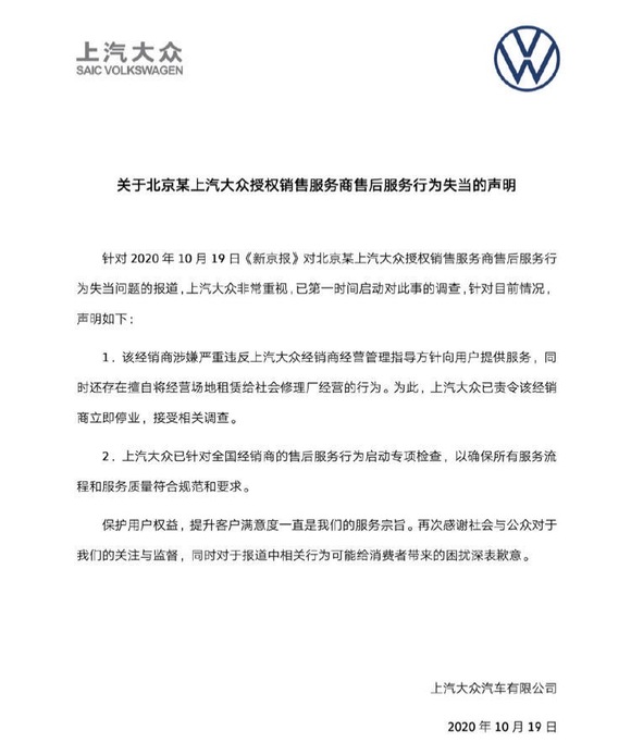 10月19日,上汽大众在官方声明中表示,对于报道中相关行为可能给消费者带来的困扰深表歉意。并表示,该经销商涉嫌严重违反上汽大众经销商经营管理指导方针向用户提供服务,同时还存在擅自经经营场地租赁给社会修理厂经营的行为。为此,上汽大众已经责令该经销商立即停业,接受相关调查。